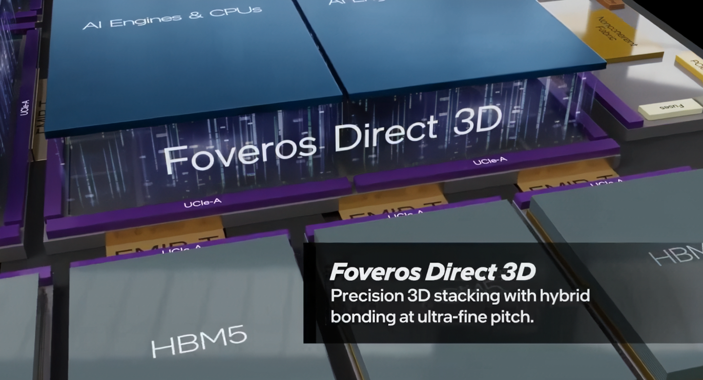 两者通过 Foveros Direct 3D 技术进行垂直互连,利用混合键合(Hybrid Bonding)实现了极小间距的高速通信。