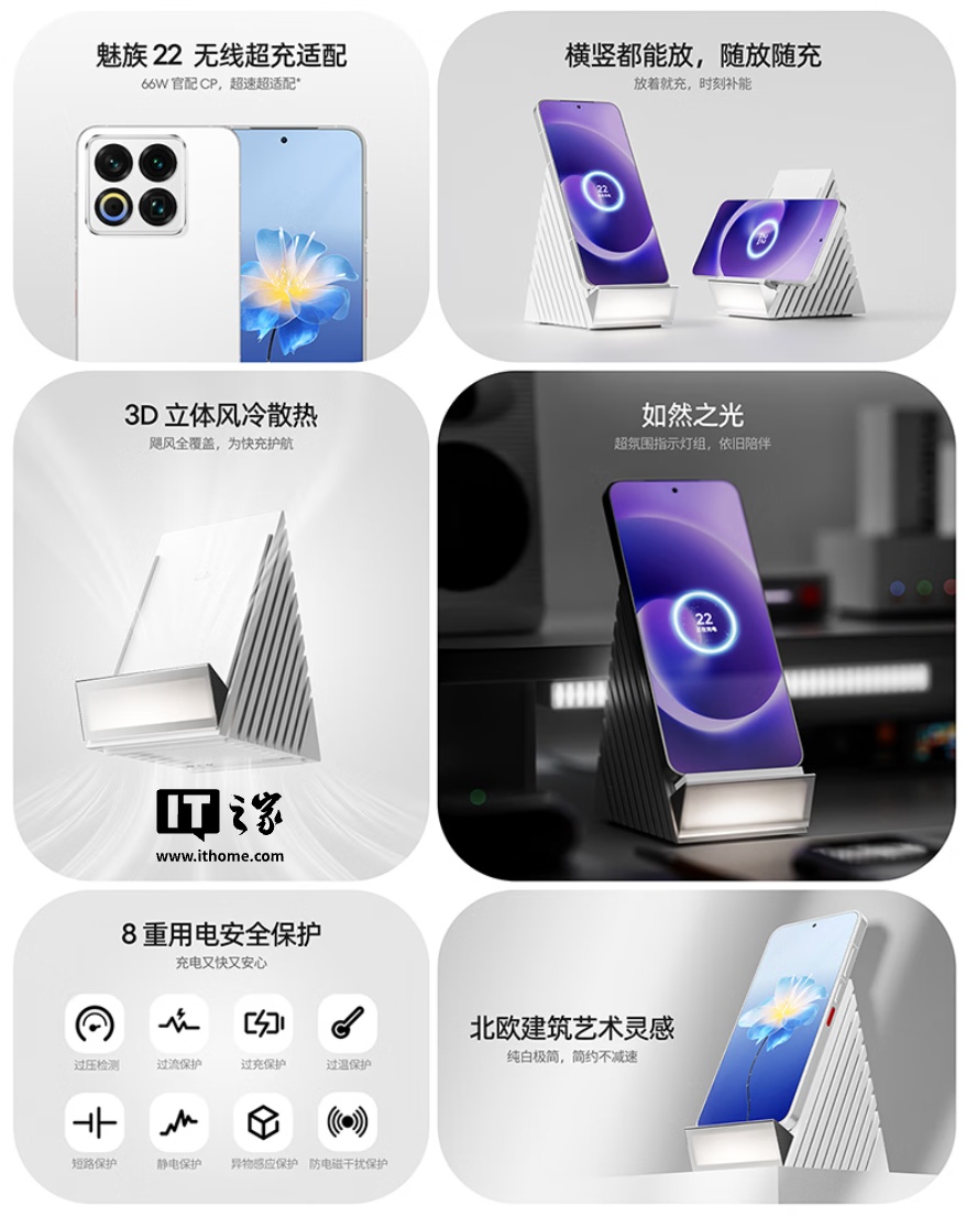 该无线充电器使用 3D 立体风冷散热系统,支持手机立卧充电,其支持为魅族 22 手机 66W 充电,为魅族 21 Pro/20 Pro 手机 50W 充电,官方称“通常为其他安卓手机充电功率为 10W,为苹果手机充电功率为 7.5W”。