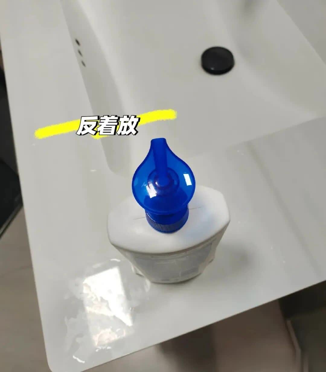 洗手液反过来放,洗手液口是对着洗手池的,挤洗手液的时候,用一只手就可以搞定了。