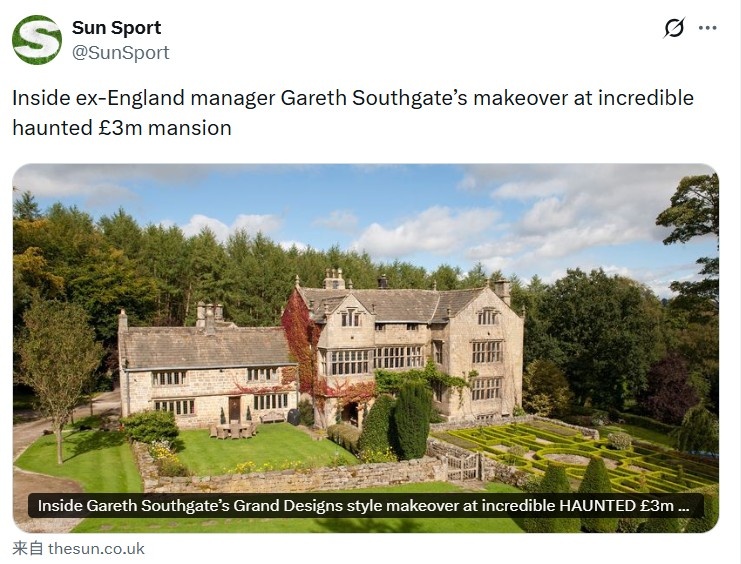 太阳报:索斯盖特准备改造其325万镑闹鬼豪宅 但得给蝙蝠留空间