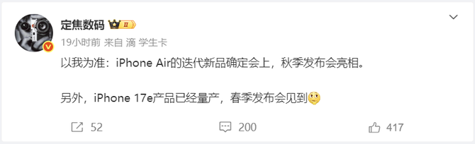 除了曝光 iPhone Air 2 的消息外,@数码定焦 还表示称 iPhone 17e 预计将在苹果春季新品发布会上亮相,该发布会一般在每年 3 月举行。