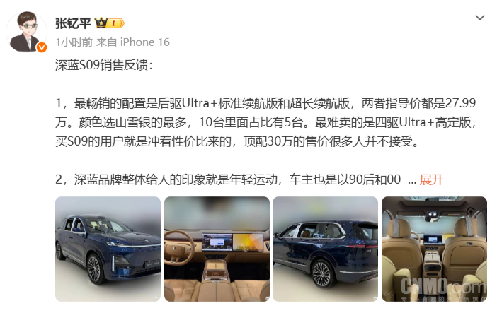 【CNMO科技消息】12月25日,博主“张钇平”曝光了深蓝S09的一线销售市场反馈。信息显示,深蓝汽车旗下中大型SUV深蓝S09自上市以来已形成清晰的市场画像与销售特征,而反馈信息主要围绕车型配置偏好、车主画像、竞品