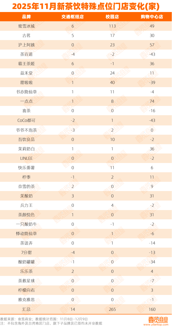 从特殊点位来看,三个特殊点位合计净增439家。校园点位合计净增265家,其中,蜜雪冰城开店最多为113家,与甜啦啦的40家,为校园店的增长贡献超过一半。