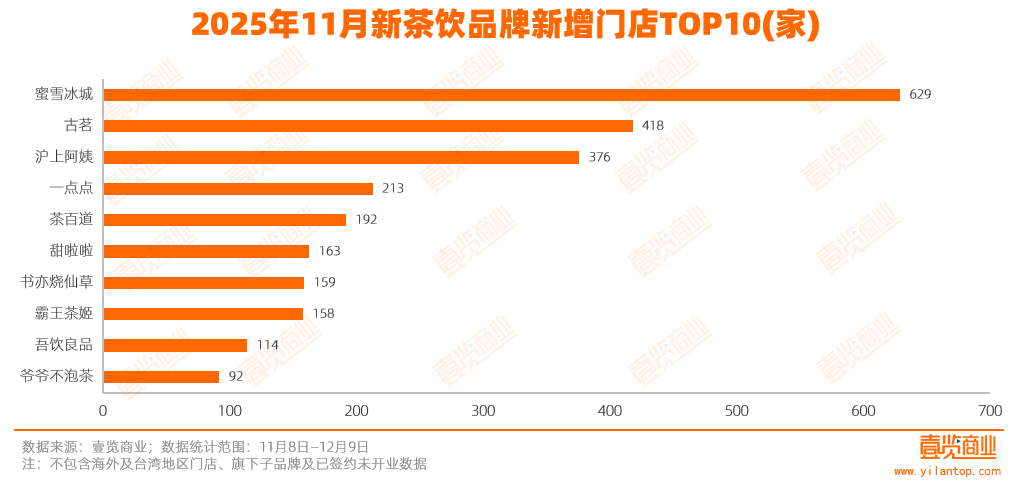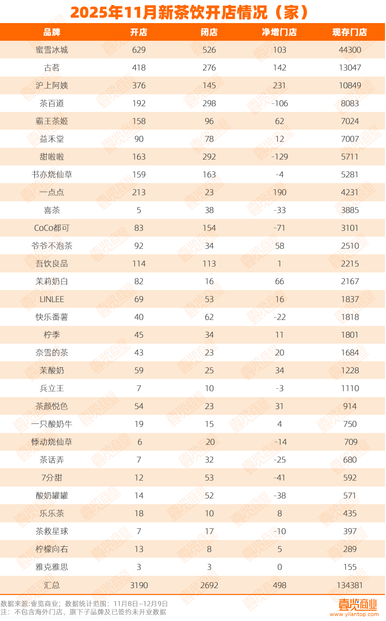 2025年11月,壹览商业监测的30个连锁茶饮品牌合计现有门店总量13.44万家,单月新开3190家、关闭2692家,净增长498家。