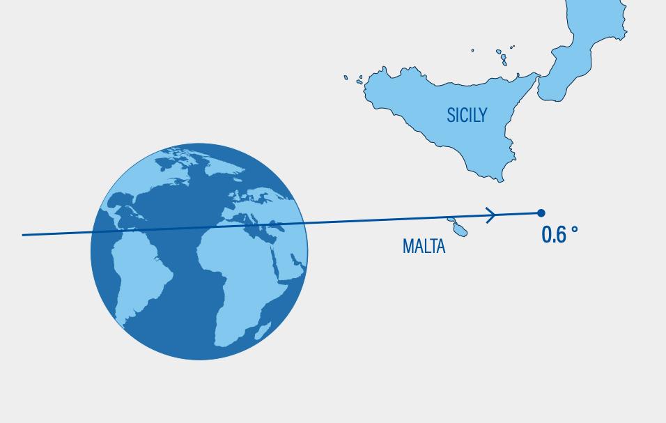 高能中微子从宇宙中进入地球,穿过地中海并掠过马耳他大陆架,其运动方向与地平线夹角仅0.6度。(图:KM3NeT合作组)