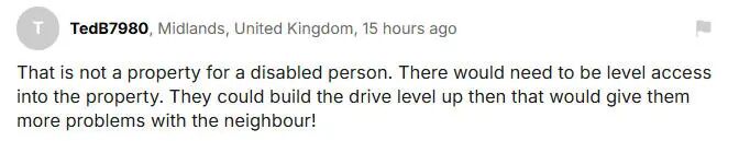 还有人称:“那套房子不适合残疾人士居住。房子需要有无障碍通道。他们如果把车道建高,只会给邻居带来更多麻烦!”