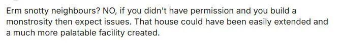 还有人为邻居辩护:“傲慢的邻居?不,如果你在没有获得许可的情况下建造了一个庞然大物,那就别怪会惹来麻烦。那栋房子本可以通过更合理的扩建方式,创造一个更合适的居住空间。”