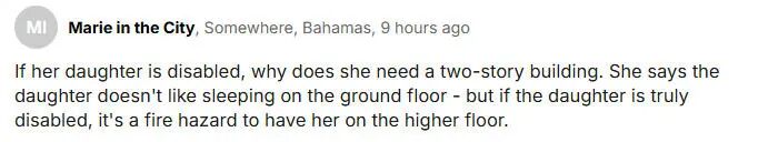 有网友称:“如果她女儿是残疾人,为什么需要两层结构的房子?她说女儿不喜欢睡在一楼——但如果女儿真的是残疾人,让她睡在楼上会有火灾隐患。”