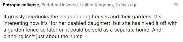有人说:“这座建筑严重忽视了相邻住宅及其花园的存在。有趣的是,它声称是‘为她残疾的女儿’建造的,但却用花园栅栏将其完全隔离出来——这显然是为了日后能作为独立住宅出售。”