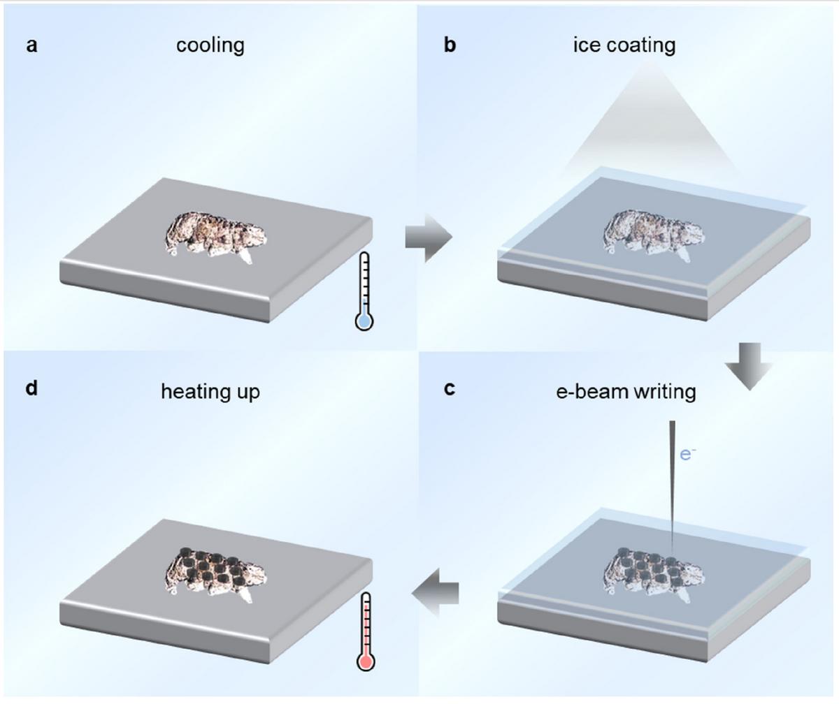 在水熊虫表面图案化的原理示意图(图片来源:参考文献[1])(a) 利用冷台将样品冷却至130 K;(b) 将苯甲醚蒸气沉积在样品表面,形成冰膜;(c) 电子束按照预设图案照射固态苯甲醚;(d) 将样品加热至室温,未被照射的苯甲醚升华,而照射区域则在样品表面形成图案。