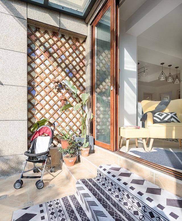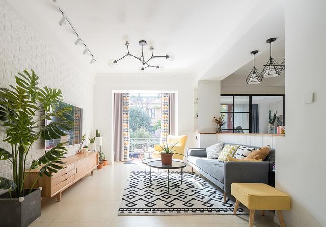 电视采用了白色文化砖墙加上百搭的原木电视柜,简约精致。通往院子用了玻璃门,房子的采光不是问题,更加通透。