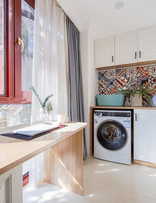 原先的阳台做成了书房,但是保留了洗衣机放的位置,平时作为休闲区,也不影响。