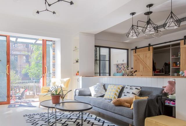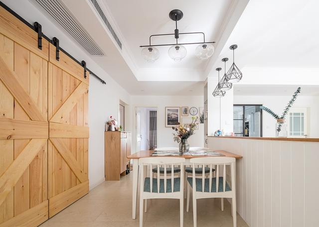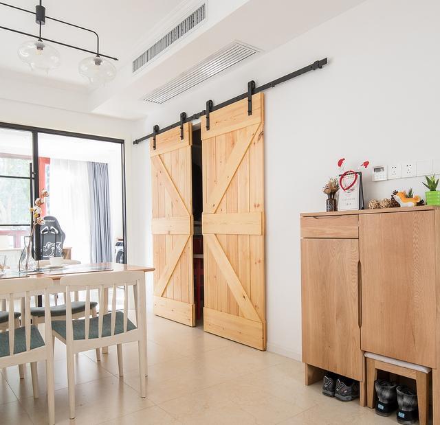 简约的铁艺吊灯和木制桌椅,谷仓门后面是储藏柜。