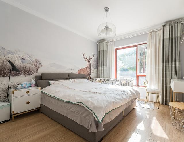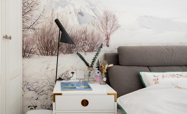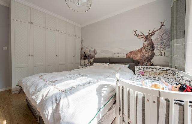 卧室采用定制的背景墙纸,个人很喜欢这样的风格,婴儿床放在床旁边,方便照顾。