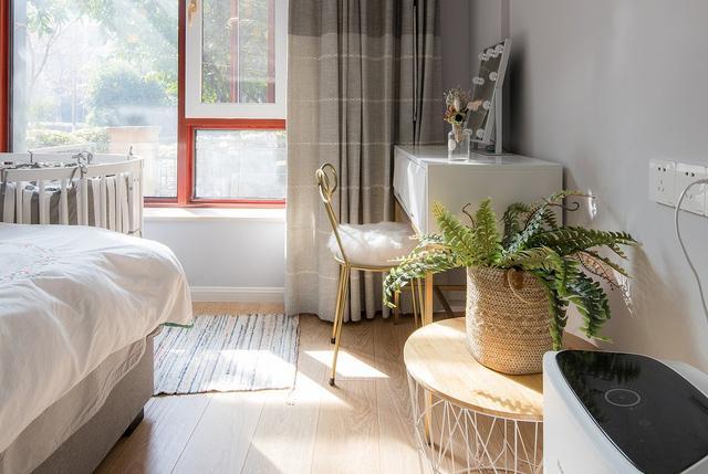 小角落放置一个小梳妆柜,镜子优雅,绿植加上阳光的照射,充满生机。