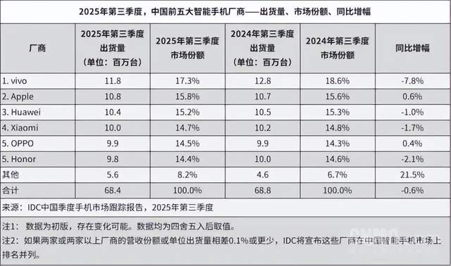 国内手机份额排名中,IDC数据显示vivo、苹果与华为处于前三,业内目前认为行业中国产手机基本形成“华米V”的格局。