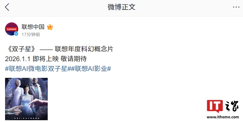 IT之家 12 月 25 日消息,联想中国官方今日宣布,联想年度科幻概念片《双子星》将在 2026 年 1 月 1 日上映。 联想中国发布的海报显示“2025 年 1 月 1 日全网首播”,但官方微博发文是“2026.1.1 即将上映”,结合微博发文