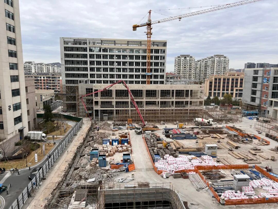 12月23日,台州市立医院迁建工程二期工地一派热火朝天景象,4幢新建建筑主体已全面结顶,工人们分散在各楼层忙碌,外墙立面施工有序推进,机电安装与装饰装修同步开展,智能化、暖通工程的专项作业声交织成奋进的乐章。