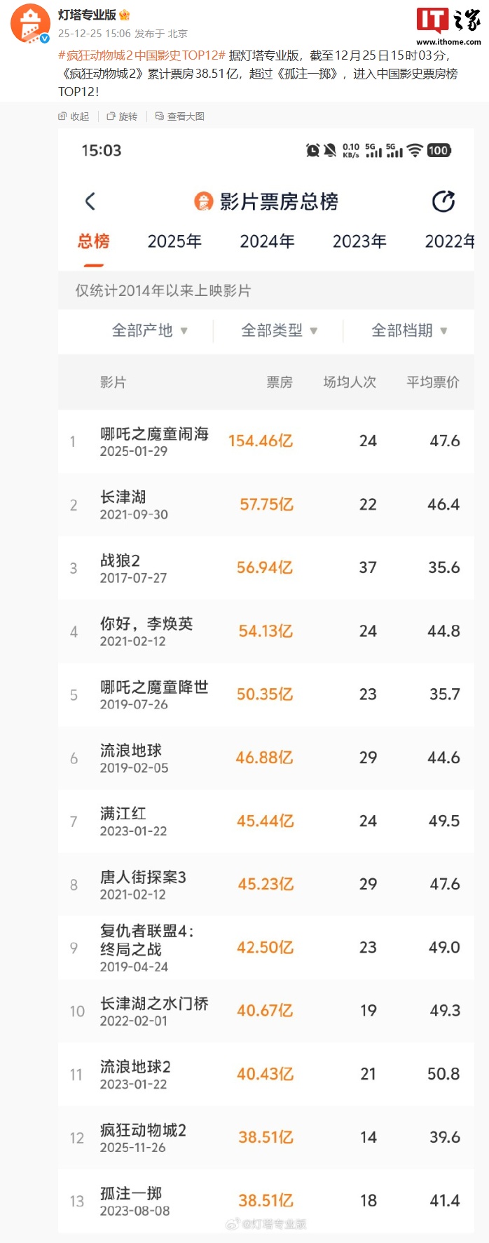 IT之家 12 月 25 日消息,据灯塔专业版,截至 12 月 25 日 15 时 03 分,迪士尼动画《疯狂动物城 2》累计票房 38.51 亿,超过《孤注一掷》,进入中国影史票房榜 TOP12