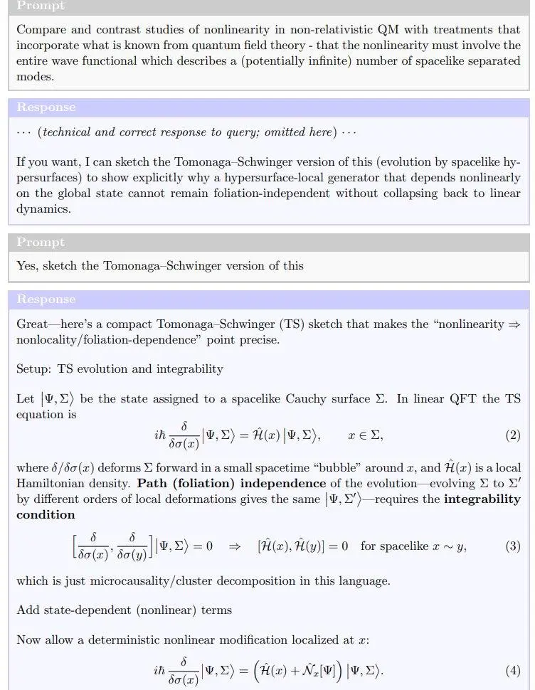 • 他向GPT-5描述了非线性量子力学与相对论兼容性的问题。
