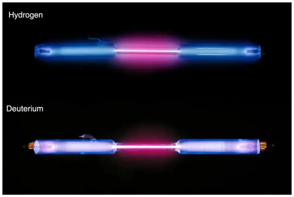 氢气(上)与氘气(下)在气体放电管中发光,分别呈现不同的光学及谱线特征。探测彗星中的氘氢比原理与之类似,仪器将探测其不同的谱线特征来确定氢同位素的种类与相对含量。