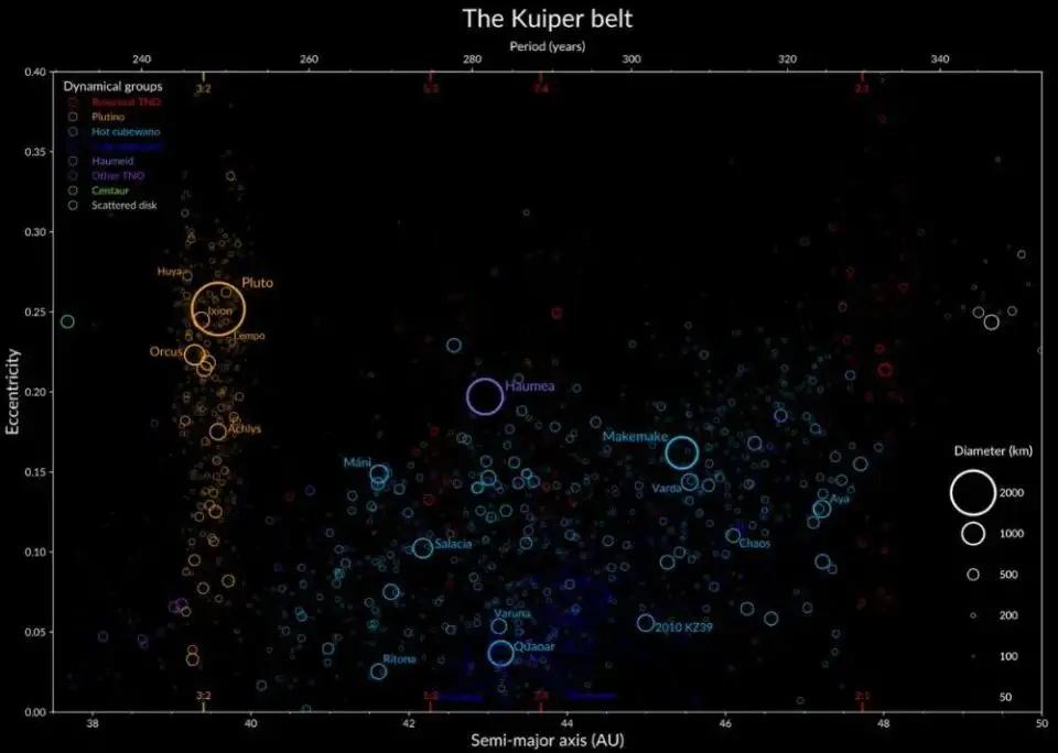 柯伊伯带的半长轴与偏心率结构。橙色表示冥卫一类天体(Plutinos),红色表示其他共振天体。天蓝色表示非共振的“热古柏带天体”,深蓝色表示“冷古柏带天体”。板蓝色部分为妊神星(Haumea)碰撞族。图中标注了若干重要天体。