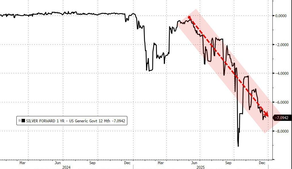 这一“扭曲”的数据意味着,交易员为立即获得实物白银所愿意支付的溢价,已比一年后交割的白银高出近7%。正常情况下,由于存在仓储、保险和融资成本,远期价格应高于现货价格。因此,理论上,该“一年期白银掉期利差”数值应为正值,以覆盖持有实物白银一年的相关成本。