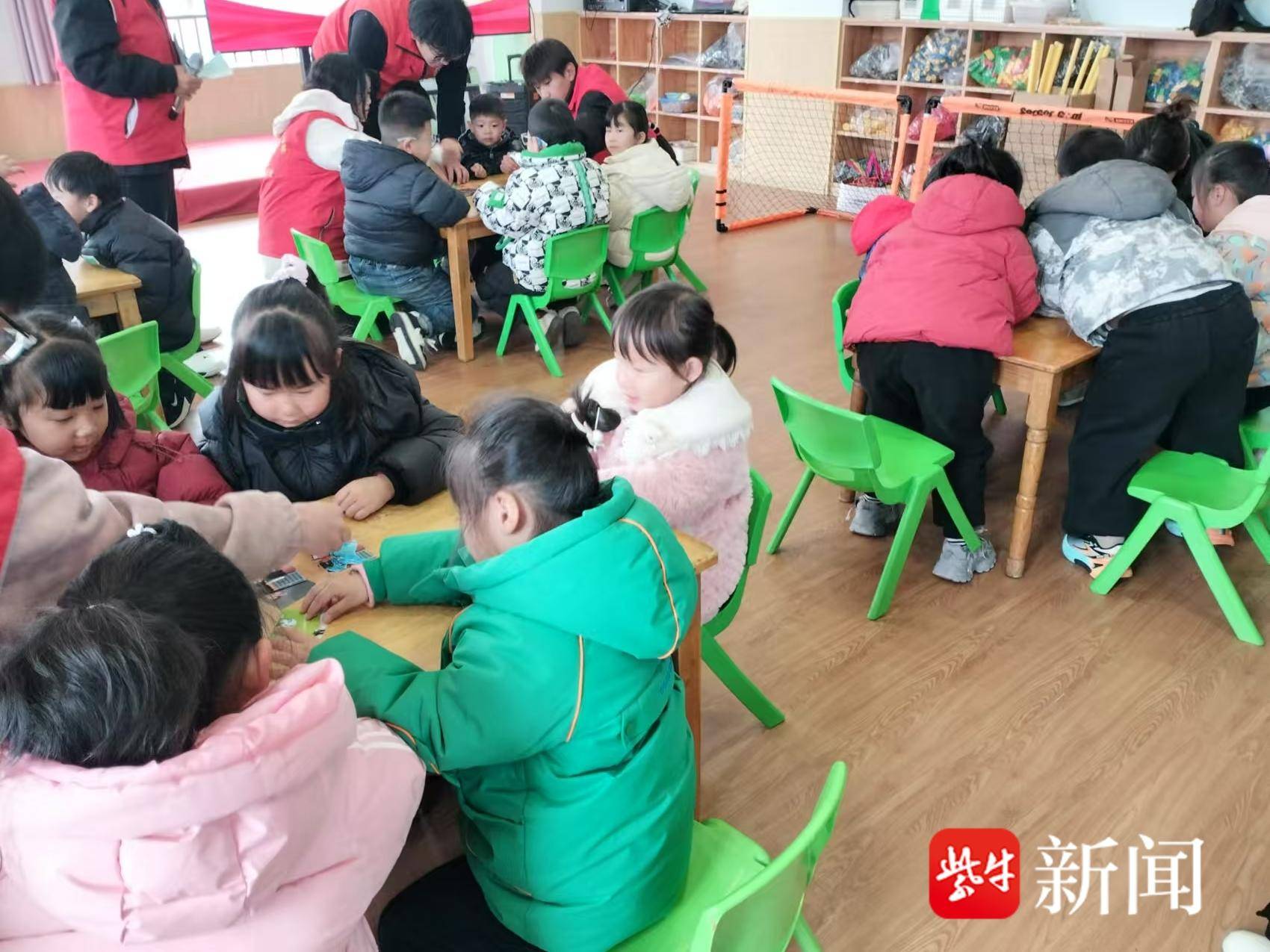 12月24日上午,盐城市新园路幼儿园二楼活动室内,欢声笑语,气氛热烈。一场盐南高新区新河街道新怡社区关工委联合盐城工业职业技术学院马克思主义学院的老师和幼儿园大班的学生、老师齐聚一堂,举办“莎姐课堂一一学苏超精神 ”活动。