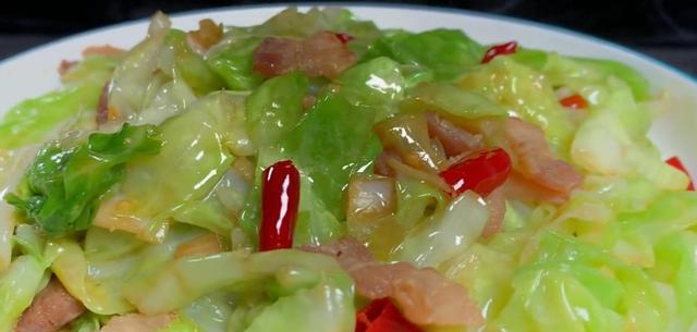 ④把锅加热,加入适量油,放入蒜末、干辣椒炒香,再加入包菜翻炒,加入盐、鸡精、生抽和水,煮沸后即可。
