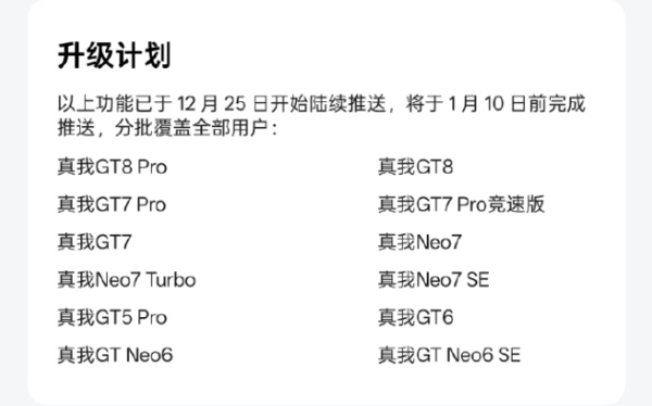 【CNMO科技消息】12月26日,realme UI产品经理@康达Leo 宣布12月realme UI 7.0全新体验升级计划。图片显示,本次升级将于12月25日开始陆续推送,1月10日前完成全部机型覆盖,涉及真我GT8 Pro和真我GT8等12款机型。