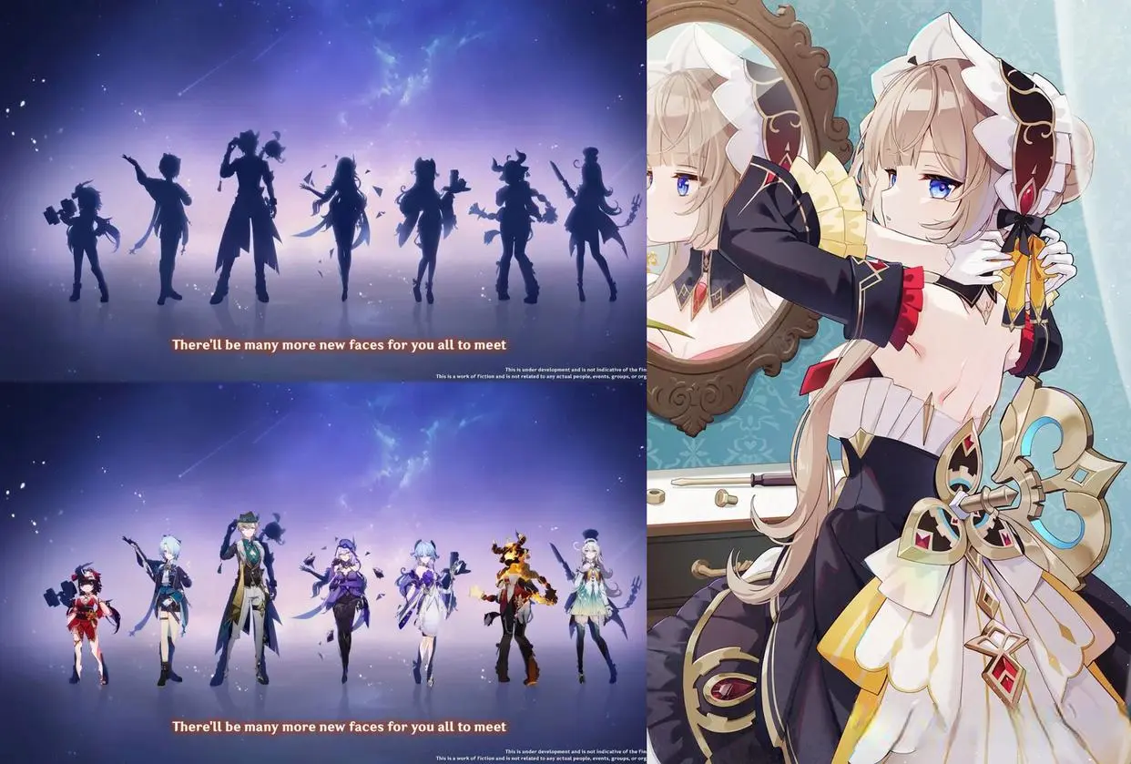 再看6.3之后的角色,法尔伽,尼可和木偶是已知形象,但还有新常驻的洛恩,雪国少女,新四星的草系角色莉奈娅再加个枫丹新卫星共有五个未知形象,而且木偶说不定还是换身衣服进池,出个七人剪影完全没问题的,大家完全可以好好期待一下。