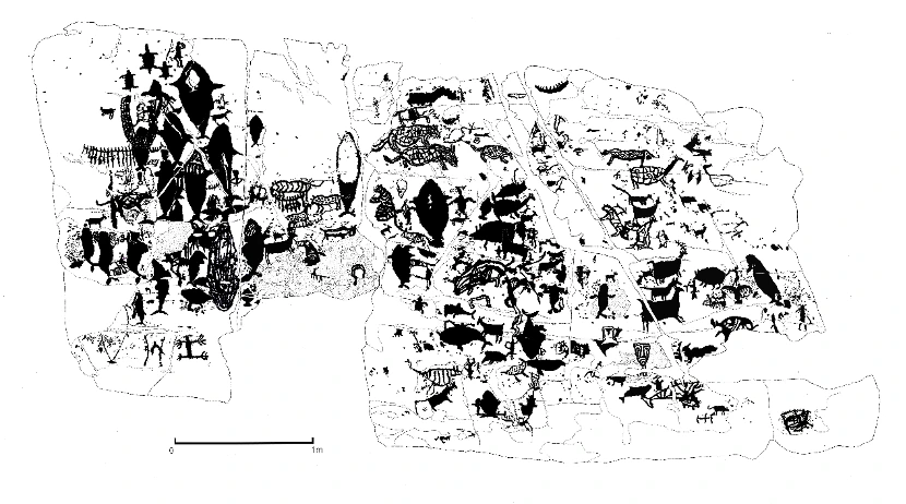 由于岩画上的其他动物都有被弓矛猎杀的场景,鲸附近也频繁出现站立在小舟上的人物形象,还浮漂着不明物体,这些都说明,当时的原住民可能已经拥有了捕猎大型须鲸的能力——驾驶小舟靠近须鲸后用弓矛杀伤是主要的方式,使用拴在绳上的浮木或其他漂浮物阻挡鲸潜水逃窜,也应该是普遍应用的手段了。