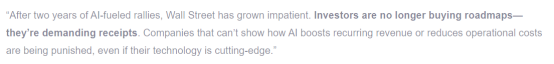 大概意思是:以华尔街为代表的投资方,不再奖励那些只会发布AI功能或者展示无限潜力和可能的产品路线图公司。