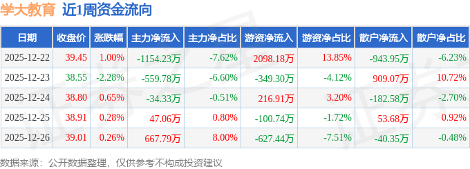 本周盘点(12.22-12.26):学大教育周跌0.13%,主力资金合计净流出1033.49万元