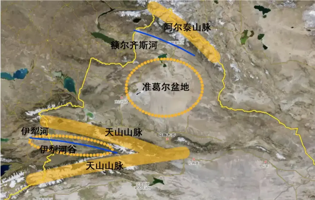 与南疆塔里木盆地遥相呼应的是北疆的准噶尔盆地,两者只隔着一条天山山脉。准噶尔盆地位于天山和阿尔泰山之间,整体呈一个三角形,其南北宽约450公里,东西长约700公里,面积达30多万平方公里,是中国第二大盆地。和塔里木盆地一样,准噶尔盆地同样也被沙漠覆盖,占其总面积30%,其中最大的是古尔班通古特沙漠,面积约4.88万平方公里。不过准噶尔盆地要比塔里木盆地相对更湿润一些,其盆地西部和北部地区地势相对较低,来自大西洋和北冰洋的水汽能够深入内陆在被天山和阿尔泰山抬升以后,带来有效降水。