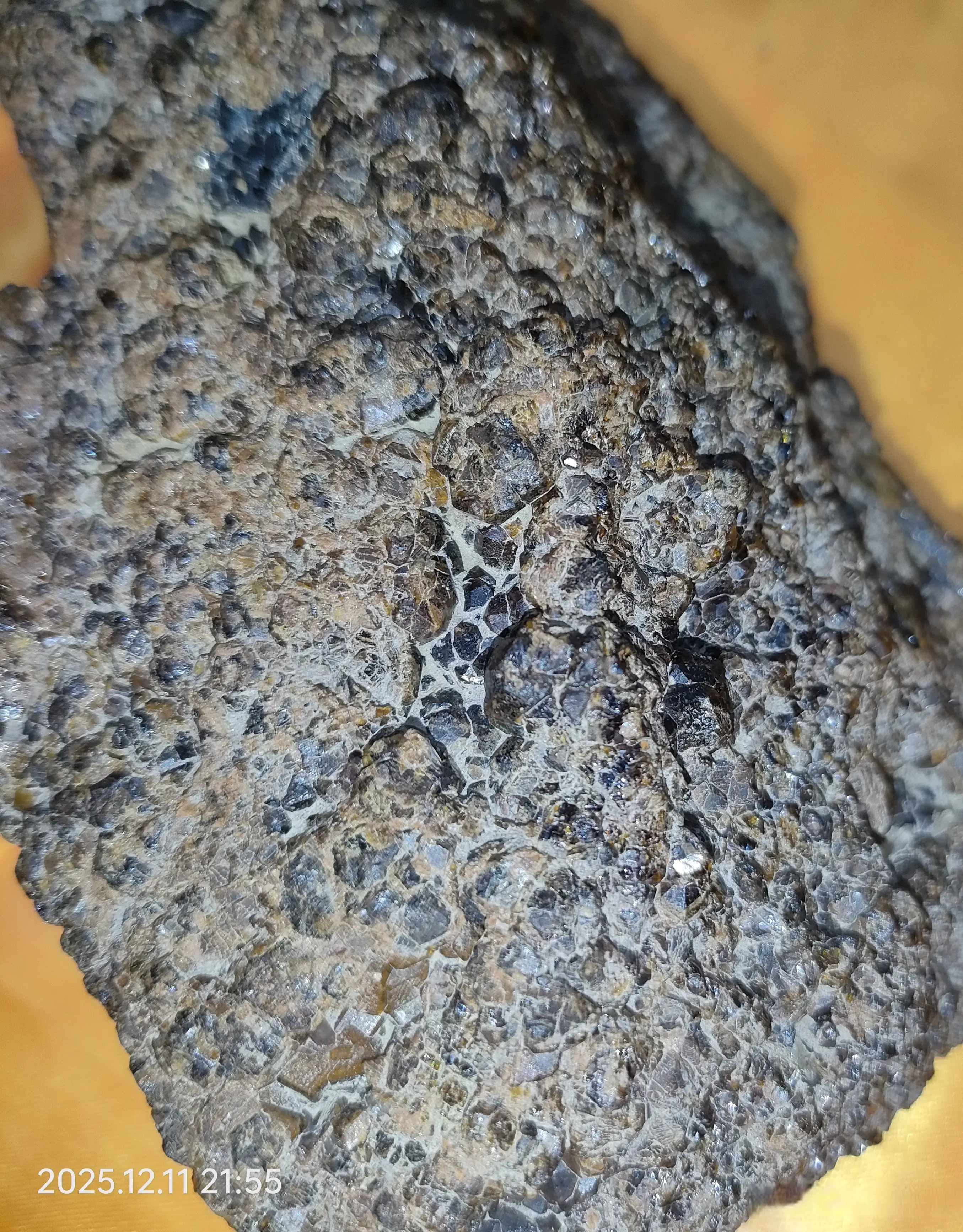 2. 关键区分:无论怎么看断面,都找不到圆形球粒;部分有细小金属闪光点(镍铁),但比铁陨石少很多。