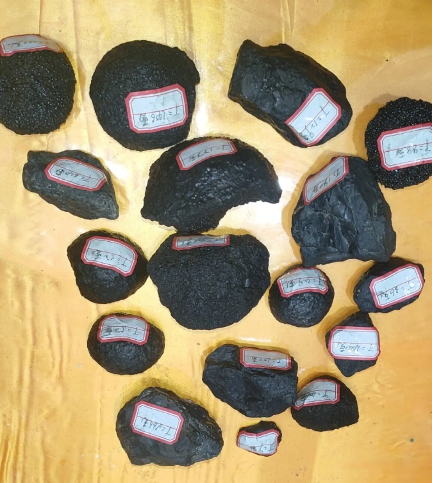 1. 核心外观:颜色偏深(墨黑/暗黑褐),熔壳多为乌黑发亮,比普通球粒熔壳更厚;