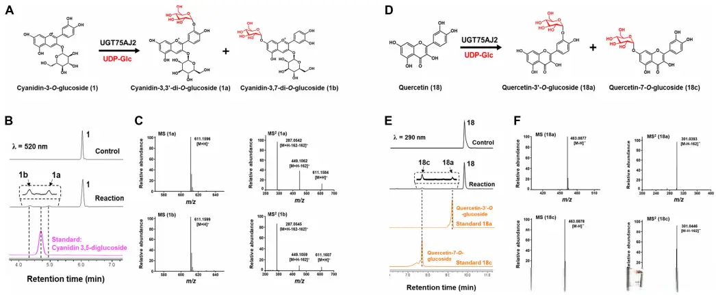 图1解析:这张图相当于酶的“身份证”,证明UGT75AJ2确实能同时在黄酮的3'-OH和7-OH位点加糖链。色谱峰像两条并排的跑道,直观展示酶的工作成果。