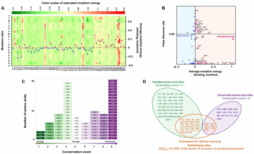 通过计算机模拟,对酶结构的4000多个位点进行能量计算,最终锁定34个关键“开关”。图2中红色斑点就像预警雷达,标出哪些突变会破坏酶结构,而绿色区域则是安全改造区。