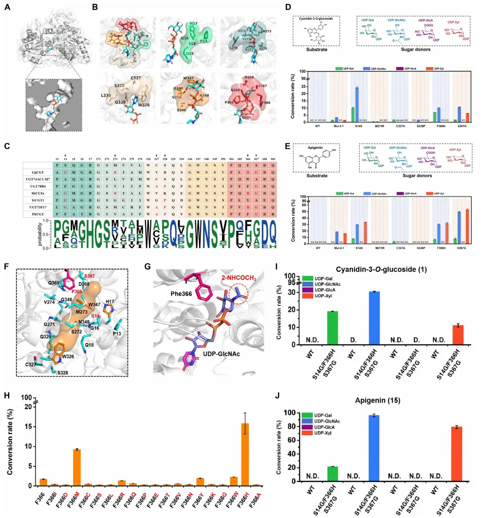野生酶只认葡萄糖,团队通过结构分析改造糖结合通道,造出三重突变体S14G/F366H/S367G。图5显示,新酶能兼容半乳糖、木糖等4种糖源,尤其用芹菜素做底物时,转化率接近100%!