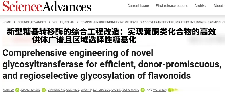 这篇重磅论文由浙江大学食品科学与营养系陈伟教授团队领衔,第一作者卢阳谢良华等人耗时多年攻关,于2025年10月3日正式发表于国际顶尖期刊《Science Advances》(科学进展)。研究瞄准黄酮类化合物——这类天然成分广泛存在于蓝莓、茶叶中,是抗癌、抗炎药物的“明星原料”,但如何高效给它们穿上“糖衣”提升药效,一直是行业痛点。
