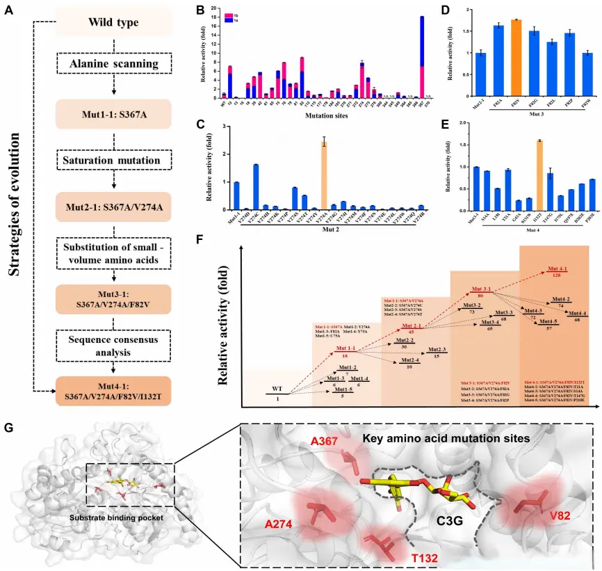 从单点突变S367A开始,逐步叠加V274A、F82V、I132T,最终造出“超级变体”Mut4-1。图3的柱状图像爬楼梯一样展示活性提升过程——从原始酶(基准线1)到128倍巅峰!