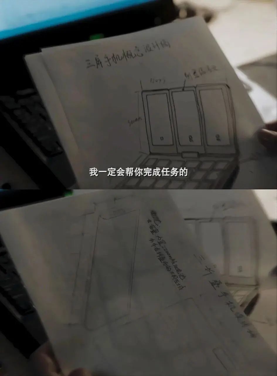 说到“我一定帮你完成任务的”镜头切到了老舅的三折叠手机设计稿,哈哈,笑不活了...