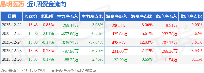 本周盘点(12.22-12.26):易明医药周跌1.20%,主力资金合计净流出2178.92万元