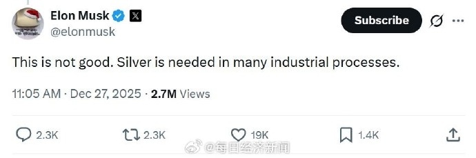 据每日经济新闻,世界首富、特斯拉首席执行官埃隆·马斯克对白银价格上涨表示担忧。当地时间12月27日,他在社交媒体平台发帖称:“这可不好。白银在许多工业生产过程中是必须的。”