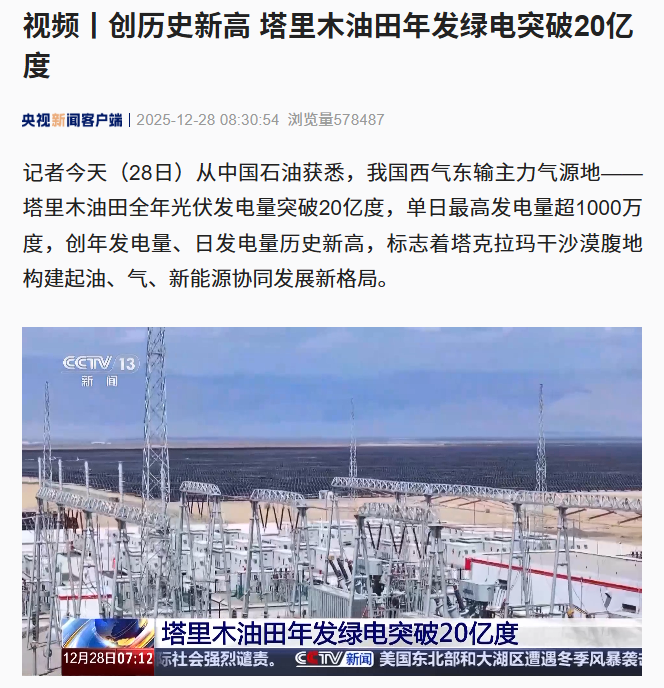 IT之家 12 月 28 日消息,据央视新闻报道,我国西气东输主力气源地 —— 塔里木油田全年光伏发电量突破 20 亿度,单日最高发电量超 1000 万度,创年发电量、日发电量历史新高,标志着塔克拉玛干沙漠腹地构建起油、气、新能源协同发展新格局。
