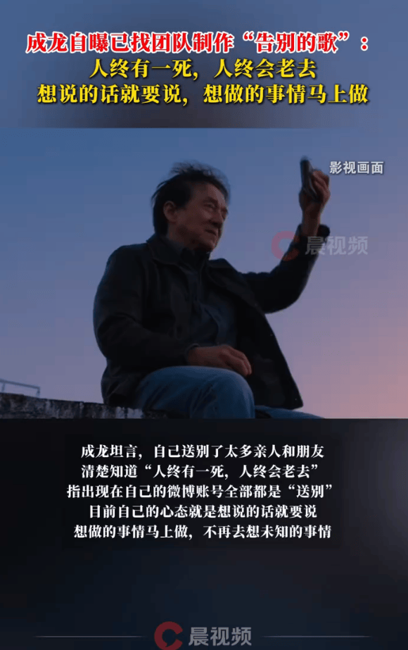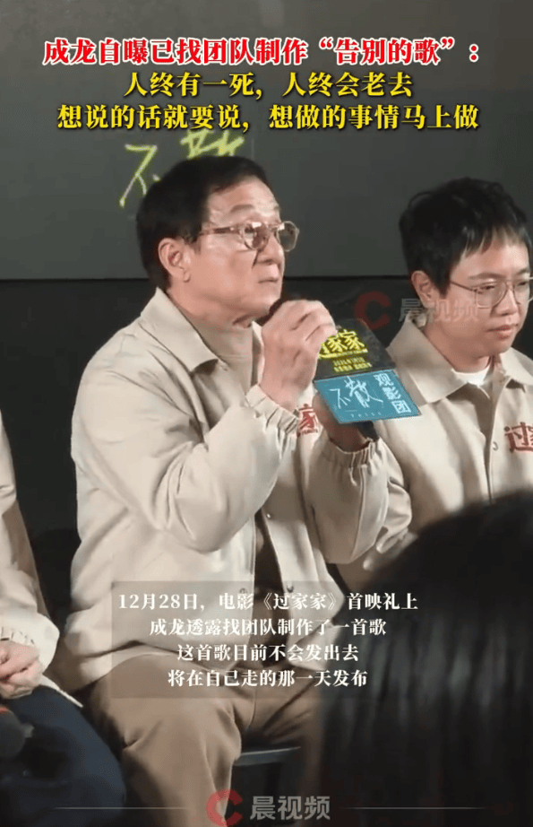 12月28日,电影《过家家》首映礼上,成龙透露找团队制作了一首歌,这首歌目前不会发出去,将在自己走的那一天发布。成龙坦言,自己送别了太多亲人和朋友,清楚知道“人终有一死,人终会老去”,指出现在自己的微博账号全部都是“送别”,目前自己的心态就是想说的话就要说,想做的事情马上做,不再去想未知的事情。
