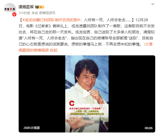(来源:潇湘晨报) 12月28日,电影《过家家》首映礼上,成龙透露找团队制作了一首歌,这首歌目前不会发出去,将在自己走的那一天发布。成龙坦言,自己送别了太多亲人和朋友,清楚知道“人终有一死,人终会老去