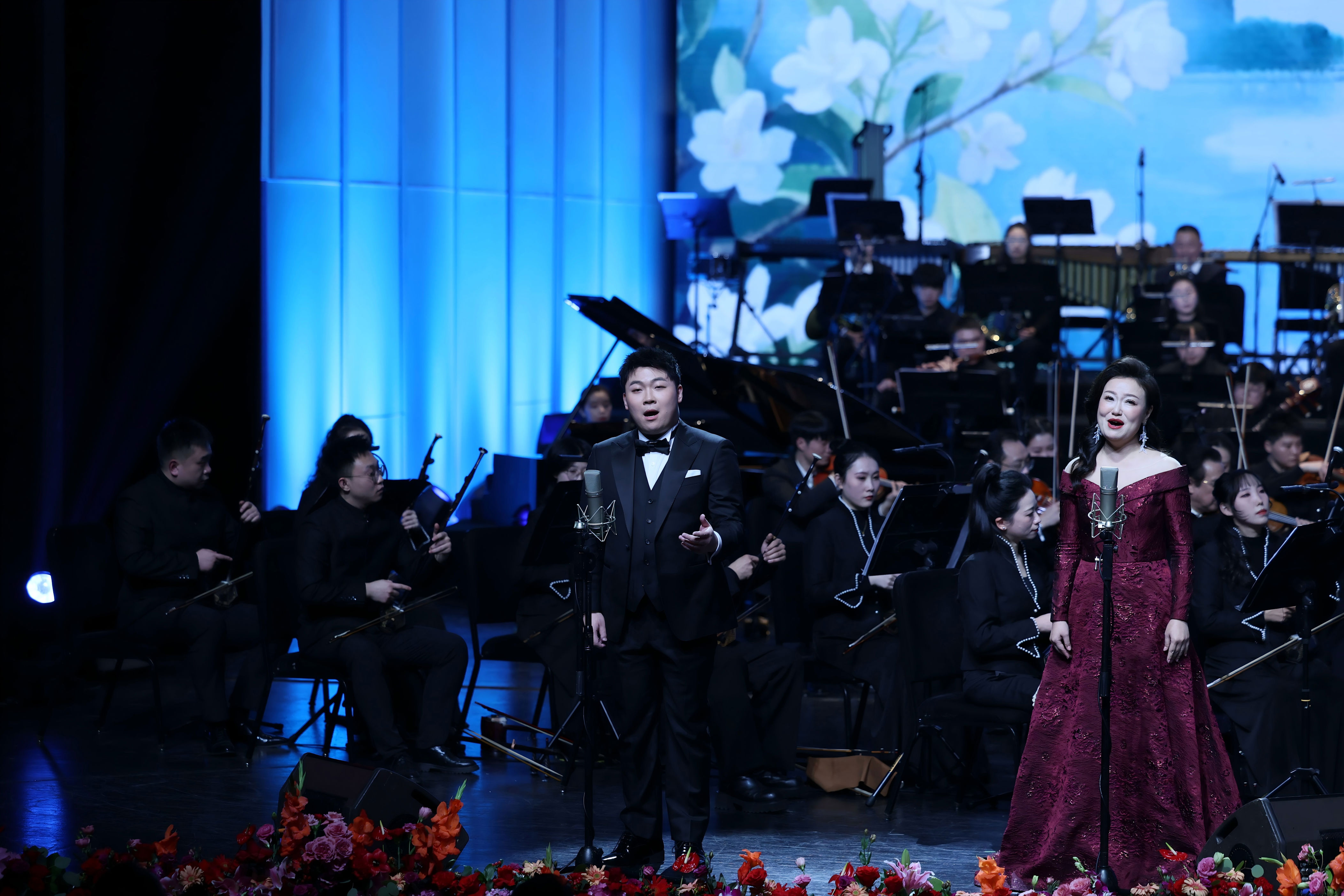 下半场,《马勒第三交响曲》第六乐章选段《日出》,以宁静旋律传递高雅艺术的深邃魅力;中央歌剧院著名女高音阮余群、首席男高音李爽联袂演绎《艺术家生涯》组曲,余音绕梁。音乐会在《轻骑兵序曲》激昂奔放的旋律中落下帷幕,战马奔腾般的节奏寓意着新一年龙马精神、马到成功。