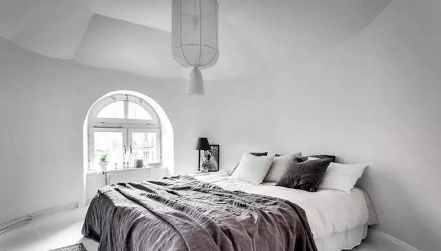卧室的天花板造型独特,具有如折纸般的立体感,再加上弧形窗户的点缀,为素雅洁净的空间增添了优雅与精致。